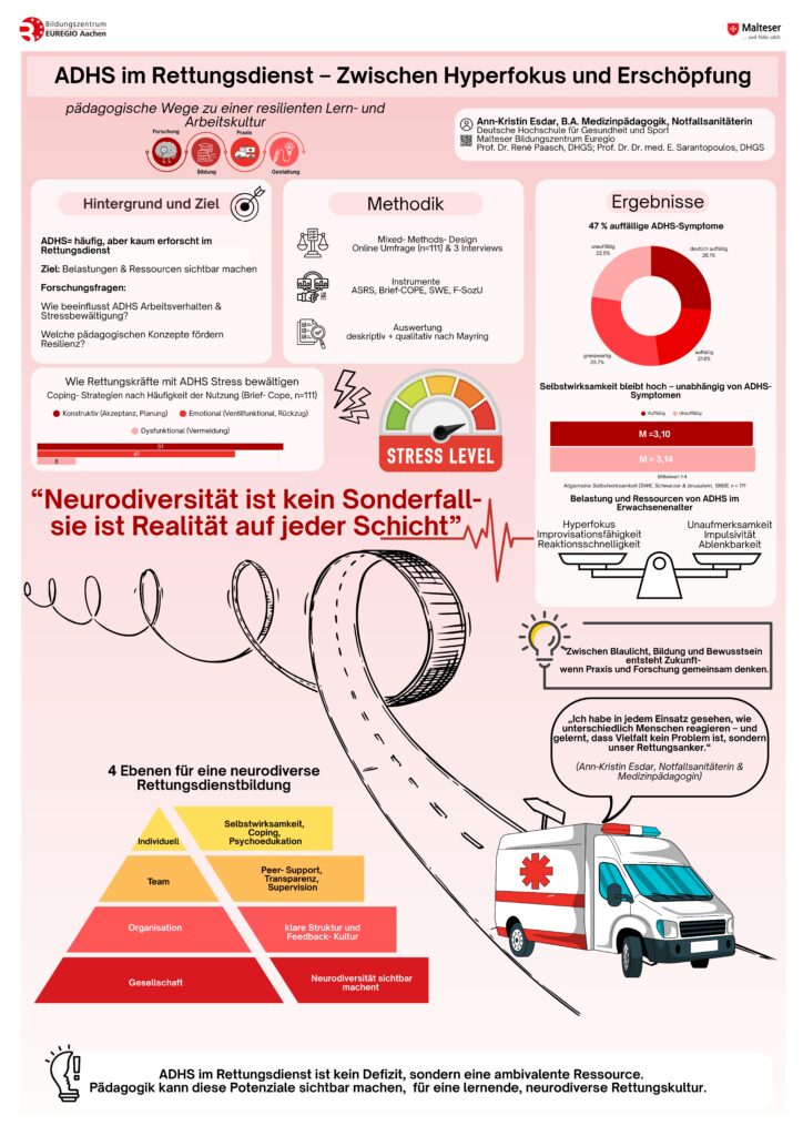 Das berufliche Selbstverständnis von Fachpersonen im Rettungsdienst prägt die Identifikation und das berufliche Handeln. Zugleich zeigen sich wachsende Diskrepanzen zwischen Ausbildung und Arbeitsrealität. Der Vortrag beleuchtet das Spannungsfeld zwischen Selbstverständnis, Arbeitsrealität und Handlungskompetenz auf Basis einer Umfrage bei Rettungsdienstpersonal in Deutschland und der Schweiz als Grundlage weiterer Forschung für die rettungsdienstliche Bildung.