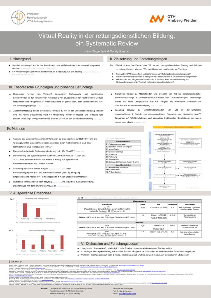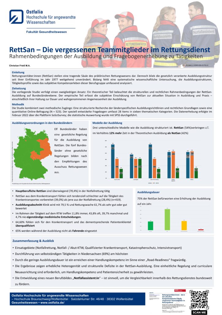 In welchem Umfang werden die theoretischen Inhalte der RettSan-Ausbildung wirksam in die praktische Ausbildung überführt? Wie entwickeln sich dabei die subjektiven Handlungskompetenzen der Auszubildenden? Auf Grundlage einer Querschnittstudie mit 132 Teilnehmenden wurde ermittelt, welche Bedingungen einen erfolgreichen Theorie-Praxis-Transfer fördern oder hemmen. Dabei wurde auch die subjektive Kompetenzentwicklung in den zentralen Handlungsfeldern des Rahmenlehrplans analysiert – darunter Krankentransport und Rettungsdienst, Versorgung nach dem ABCDE-Schema, spezielle Notfälle und psychosoziale Aspekte. Zudem wurde bewertet, in welchem Maße die praktische Ausbildung den theoretischen Unterricht sinnvoll ergänzt und welche curricularen Abstimmungen oder Anpassungen sich daraus ableiten lassen.